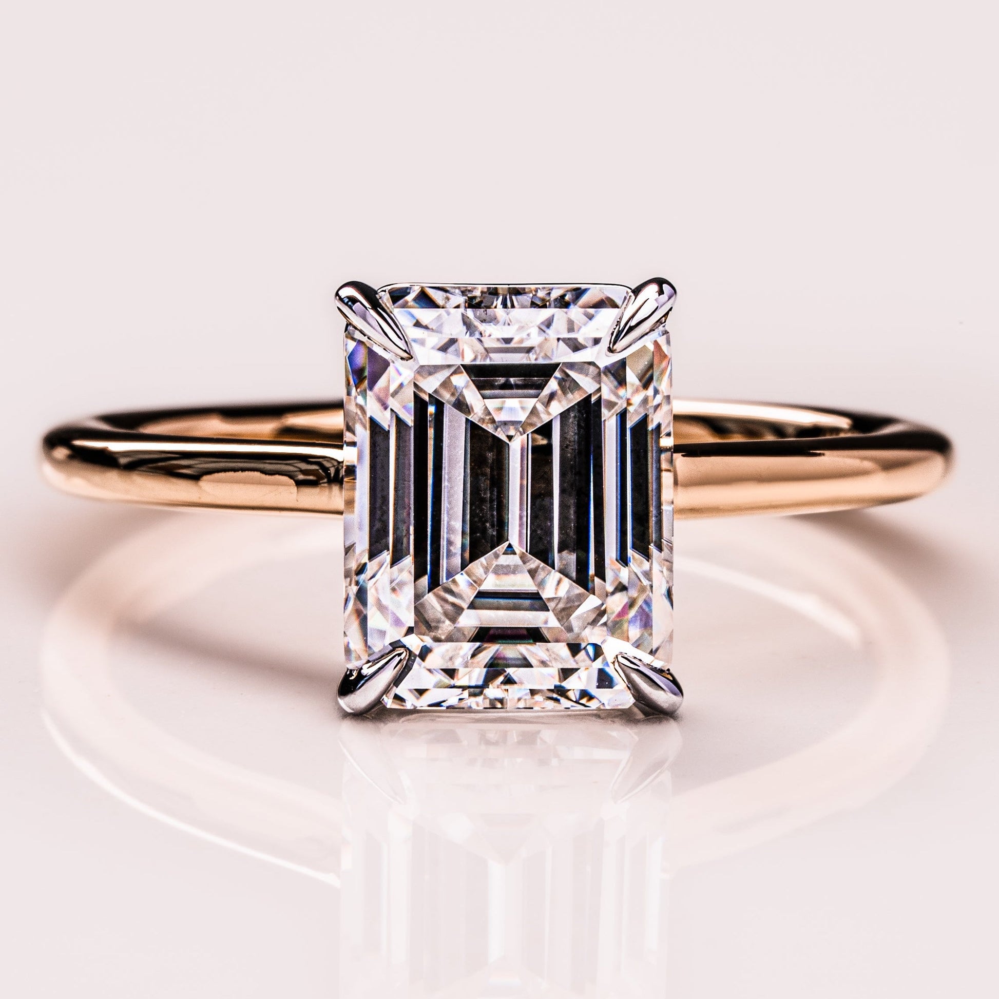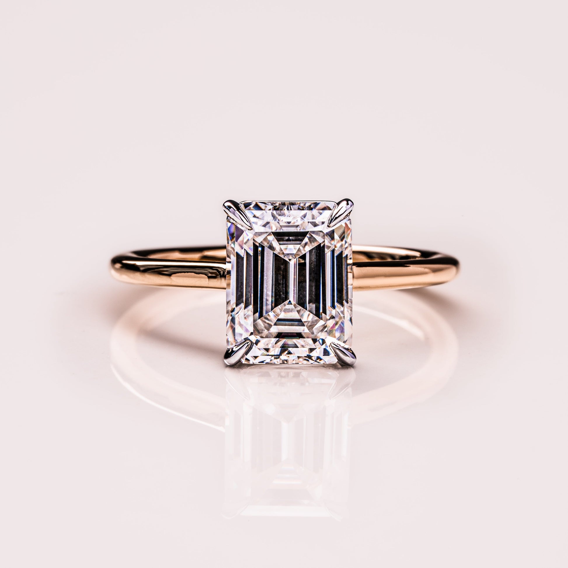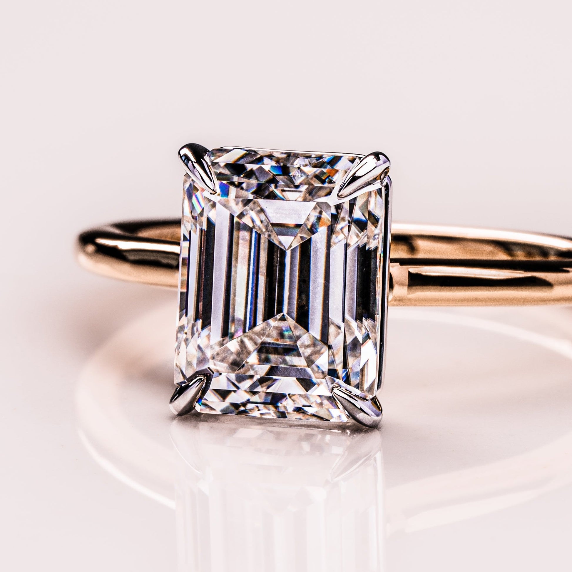 A 2.3 CT Emerald-cut Moissanite, defined by precise geometry and balanced proportions. Its clarity and structure create a composed, timeless presence.